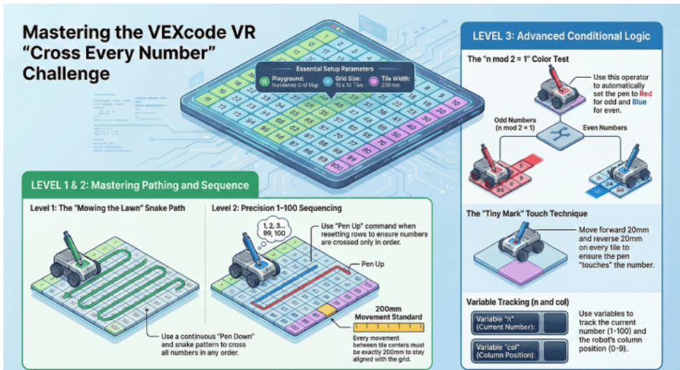 Let’s walk through the VEXcode VR “Cross Every Number” challenge together—and see how each level quietly teaches a powerful programming idea.